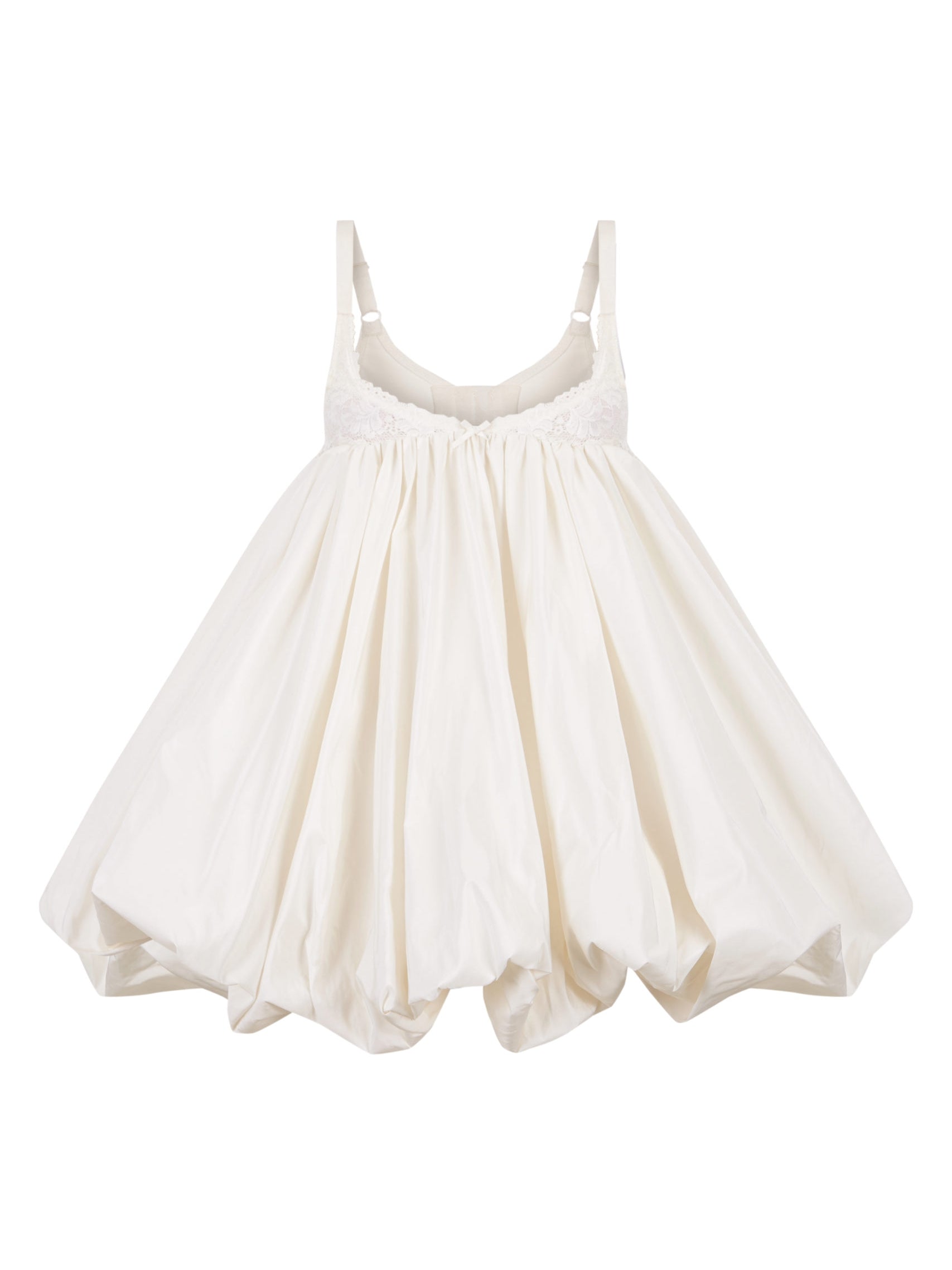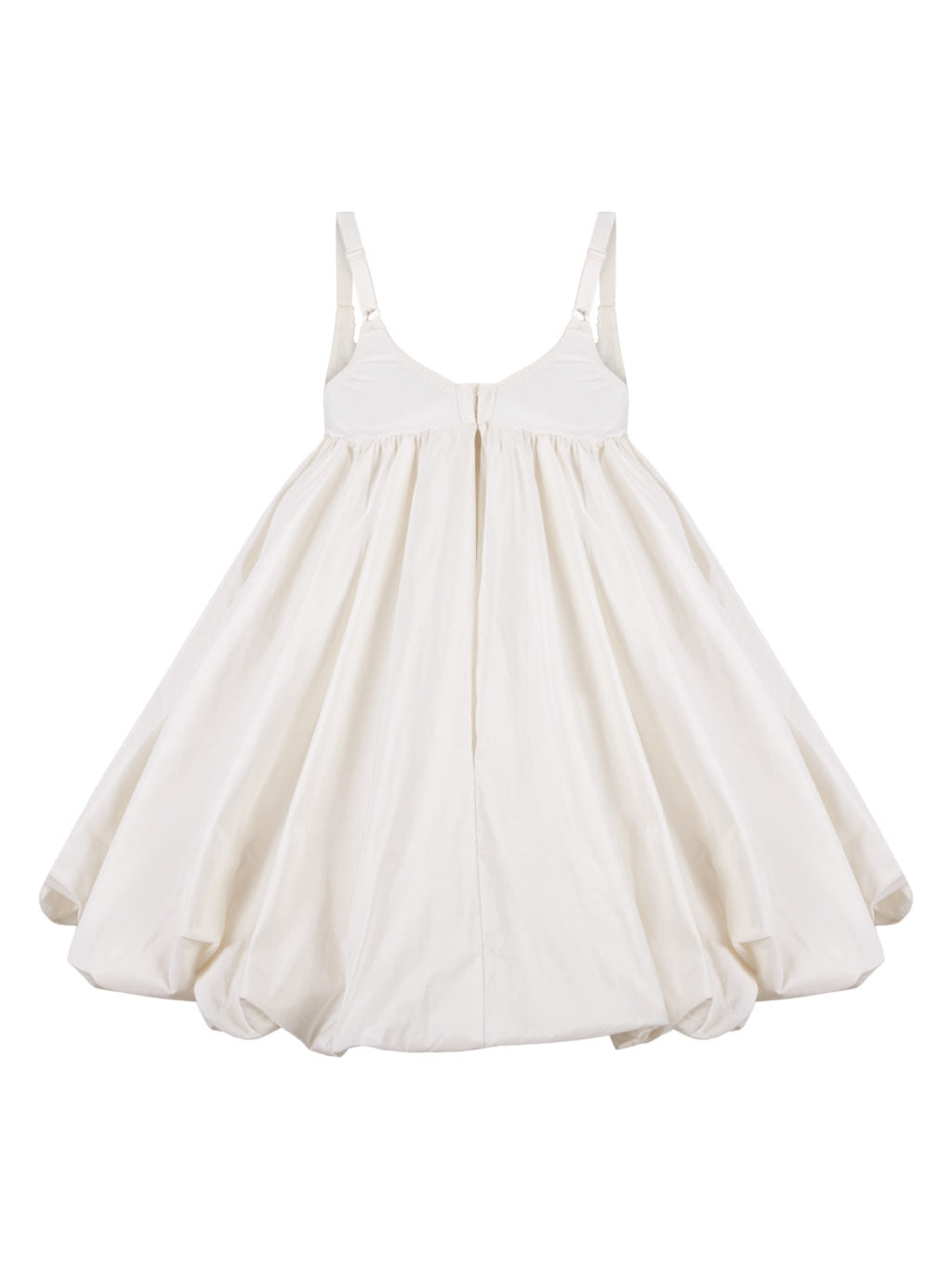 Balloon-shaped dress, crafted in off-white taffeta. The bust piece is made from deadstock lingerie. Concealed snap buttons at the back. Each piece is unique due to the use of deadstock material, so color may vary slightly but the style remains consistent.