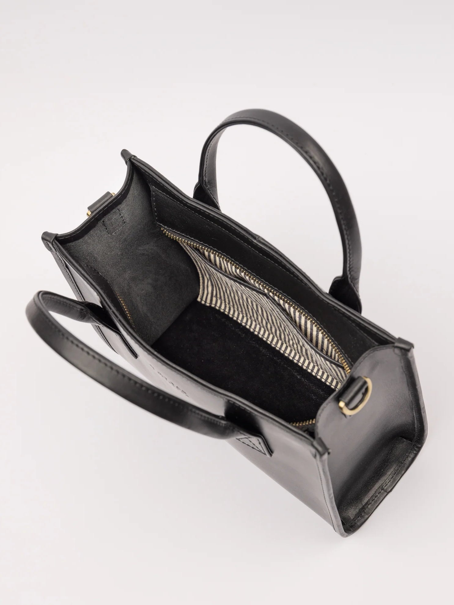 It features a main compartment with a zipper closure and four interior slip-in pockets. The structured silhouette comfortably fits a notebook and a small water bottle, making it a practical choice for daily use.