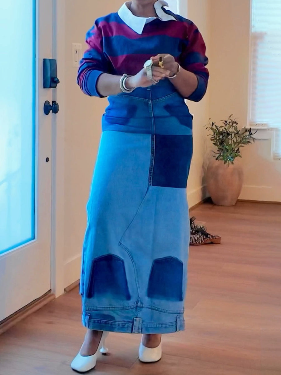 Maxi length skirt by flameprettywith a pieced fabrication and cut with a raw edge at the hem. This modern design was created by flamepretty from unique vintage and deadstock items found around the world. Though similar in style to what you see here, each upcycled item is one-of-a-kind and may vary from piece to piece.