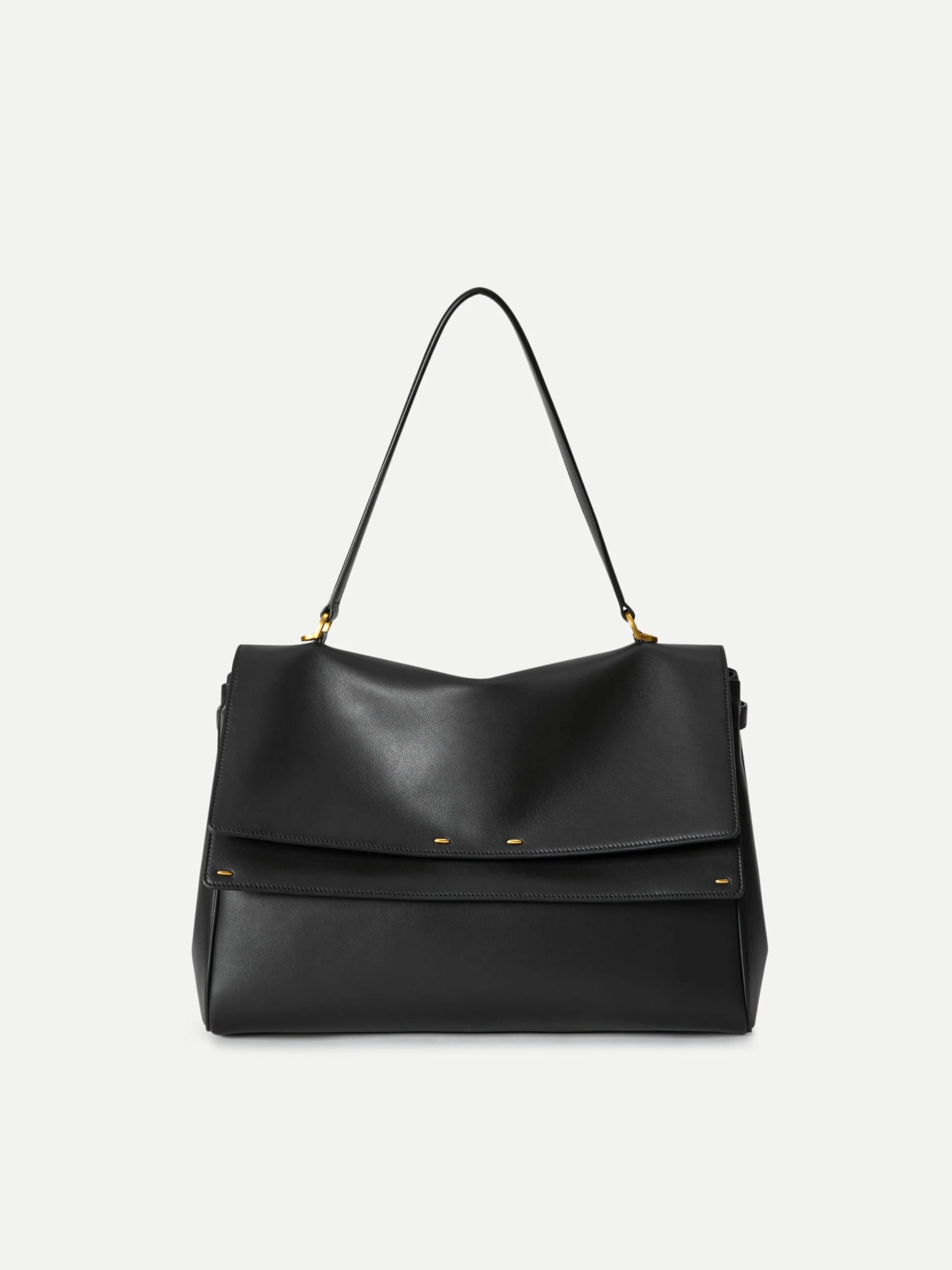 The double-flap design offers flexible styling—wear both for structure, or tuck one in for a cleaner look. Built for function with a touch of play, it includes two detachable straps for hand carry, shoulder, crossbody, or backpack wear. Inside, the space is thoughtfully divided to fit a 13” laptop and more. Every detail—from the custom matte-gold lock to the luggage strap—is meticulously crafted for reality.