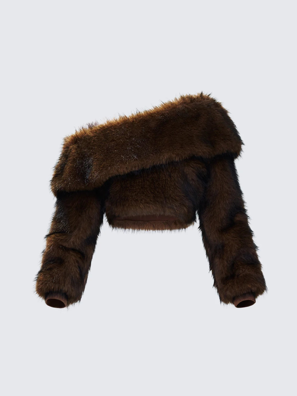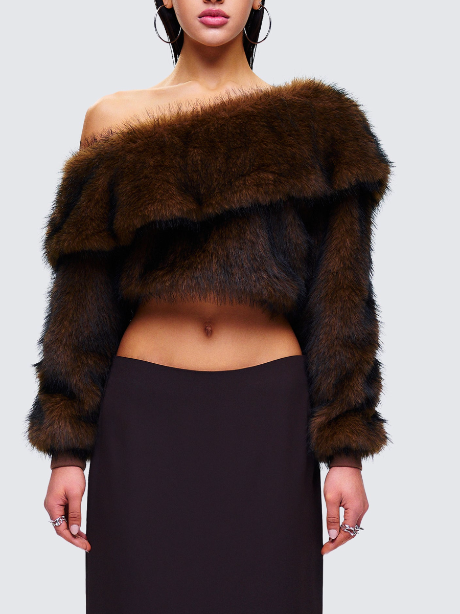 Fur, real drama Let the world know you’ve arrived in style with this off-shoulder top, made from luxe faux fur and finished with a bold contrast rib cuff. It’s all about the statement, the glamour, and the attitude.