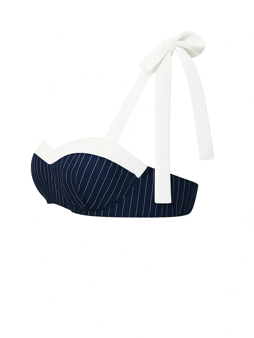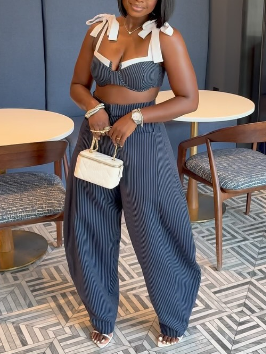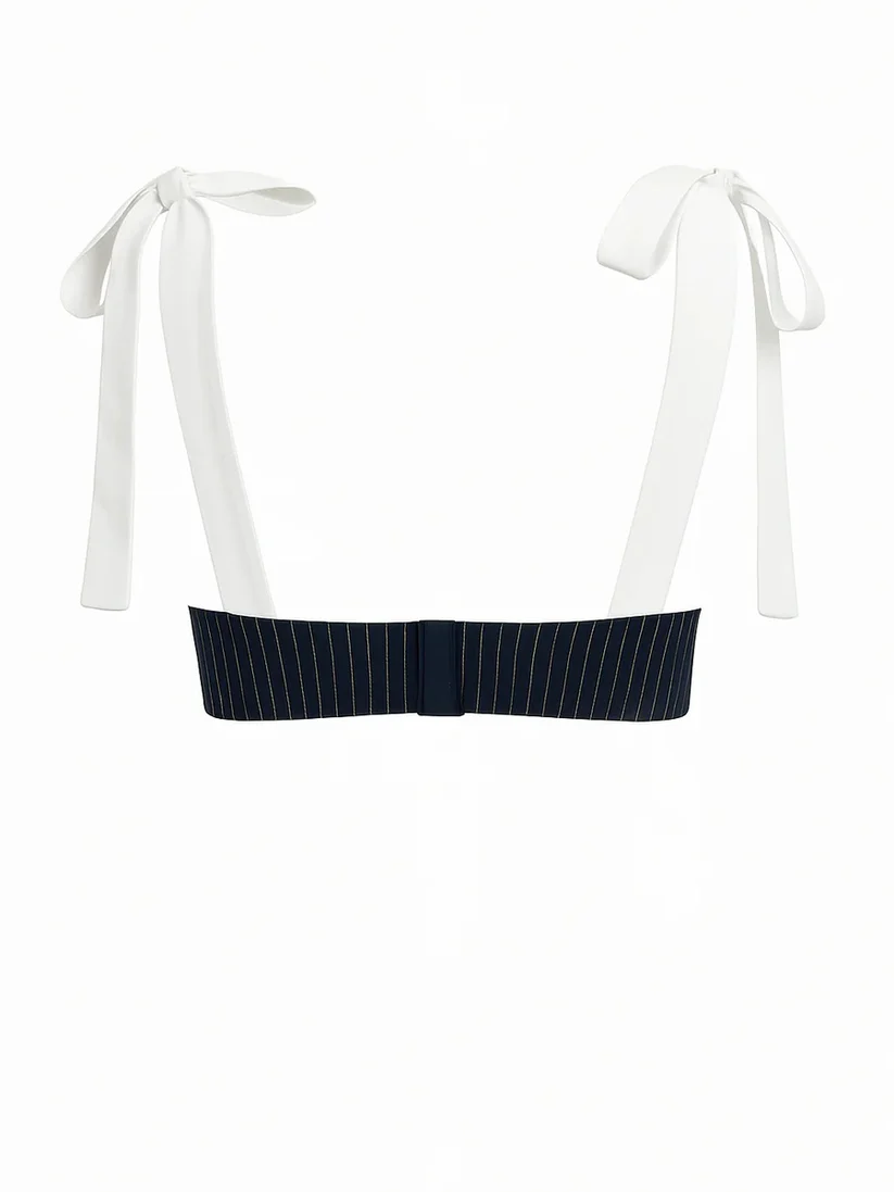 We set a high standard creating this top out of a delicate polyester fabric, thick bra straps that ties into the cutest bow, underwire for structure and an adjustable bra fastening. This top pairs well with our Pinstripe Poise Pants!