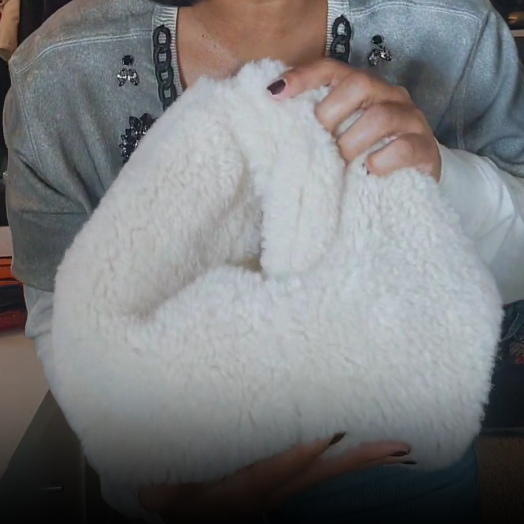 Shearling Bag is crafted from faux shearling with a hobo silhouette and a pleated handle. The bag features an open top and a textile lining. It measures 6 inches in height, 11.5 inches in length and 4 inches in depth. The handle drop is 4 inches.